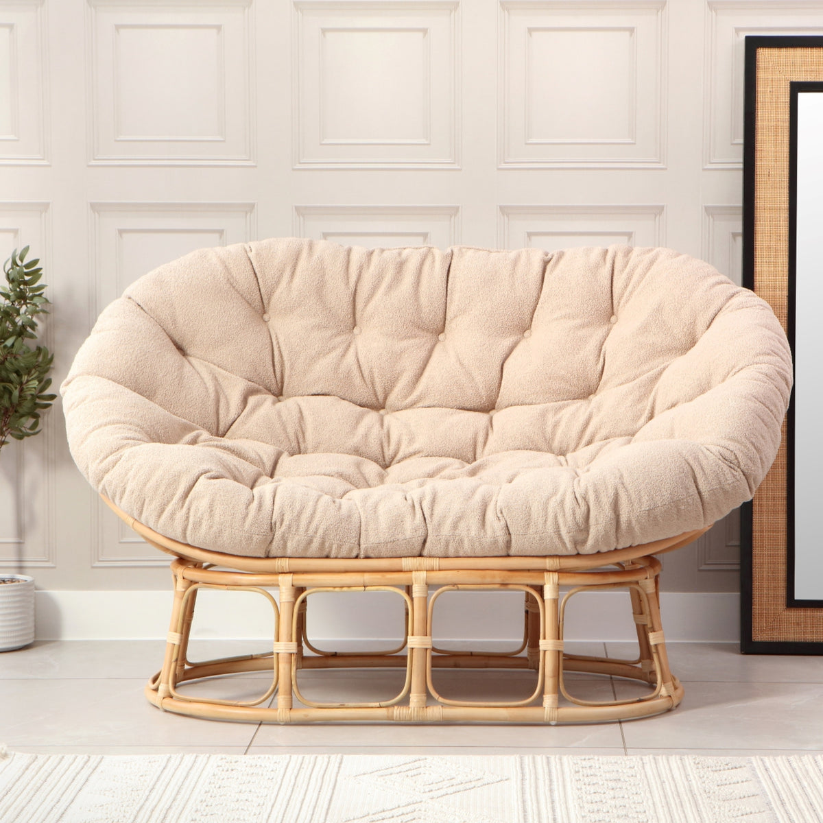Natural Rattan Papasan Sofa in Cloud Cream Boucle