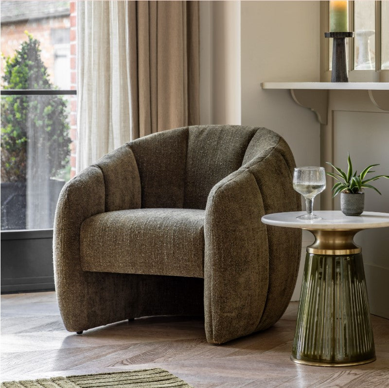 Add a stylish design piece to a room with this stunning tub chair. Fully upholstered in lovely green fabric with vertical stitching to add an extra design detail, the chair would look at home in a wide range of rooms.