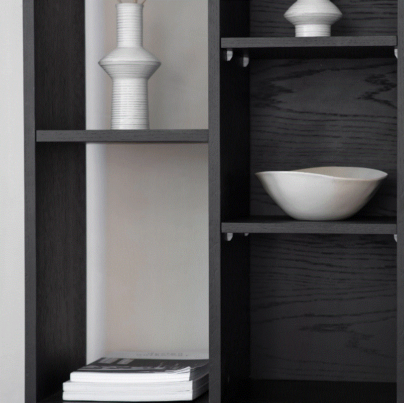 This eye-catching display unit combines oak stained in a black finish and walnut veneers with black metal legs to create a stunning contemporary look. Cut out circular handles with a wood panel behind add an interesting and unusual design feature. The cupboard doors slide to open and the central section of the open display area has three adjustable shelves. The shelves on the left and right sections are fixed.
