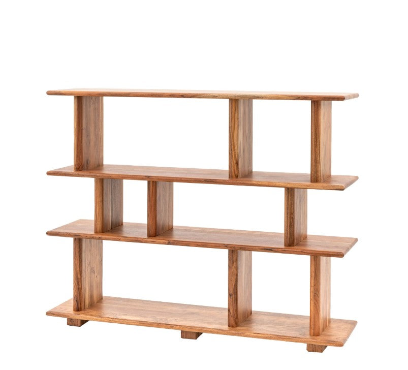 Made in rich and deeply grained Acacia wood this open shelving unit is perfect for showing off your favourite books and artistic accents. The 4 wide shelves are unevenly broken up creating a unique look that will be perfect wherever it is placed. Coordinating further furniture pieces also available.