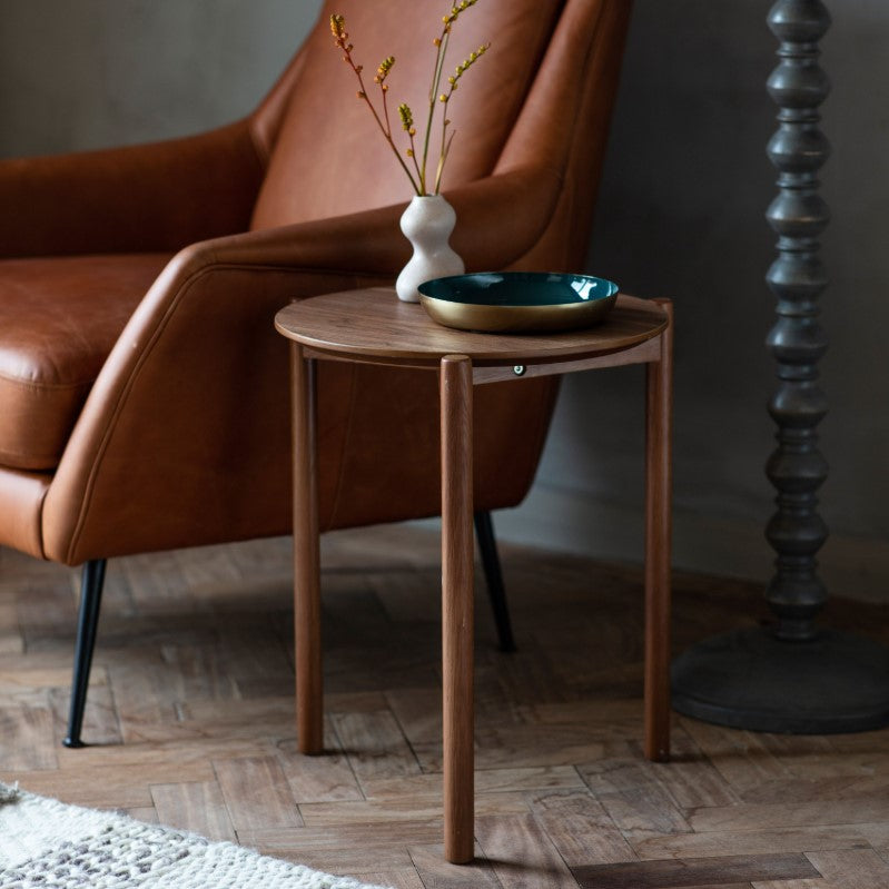 Stylish side table offering a simple yet stunning design. The circular top is crafted from walnut veneer and sits on the solid oak base, which is stained to match the top, with the ends of elegant round legs showing to echo the shape of the top.