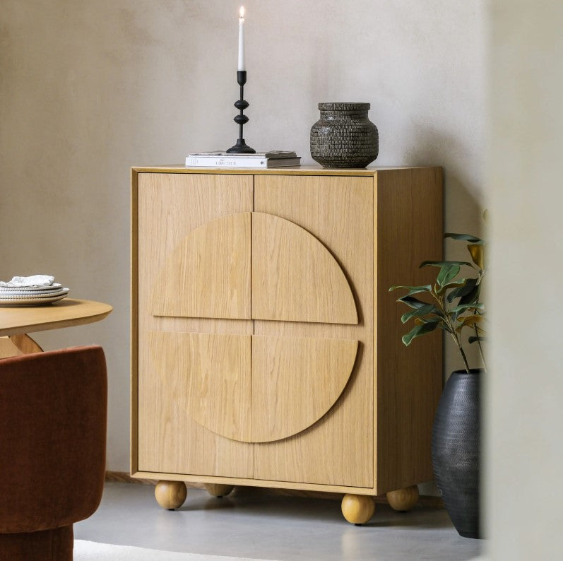 Designed to highlight the use of geometric design, with a nod towards a retro feel but in a more modern format, this stunning sideboard combines style and practicality. It features beautiful circular shaping on the doors, with spherical feet echoing this. It is made using oak veneers and solids, where practical, with a natural matt finish.