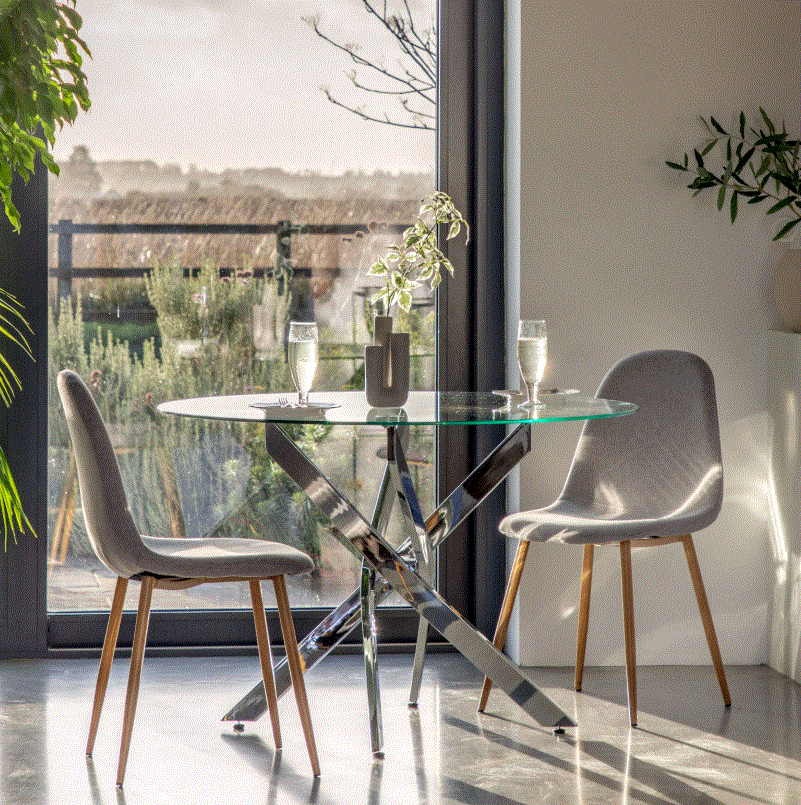 Set of 2 elegantly modern dining chairs designed to complement any interior, from modern to the more traditional. Upholstered in light grey, the chairs slim tapered legs in light oak effect foil on metal complete the simple contemporary design.