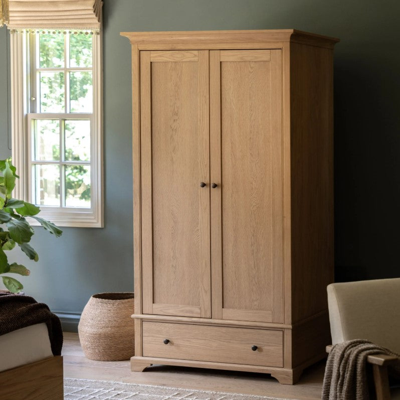 Organise in style with this elegant wooden wardrobe. Featuring a spacious double-door cupboard and a generous lower drawer, the wardrobe offers ample storage alongside timeless style and premium quality. The beautiful natural wood finish, crafted from oak solids and veneers, is full of subtle grain detail and natural beauty. Classic round handles bring a comforting, timeless elegance to the wardrobe, making it a perfect blend of style and practicality, just what any bedroom needs.