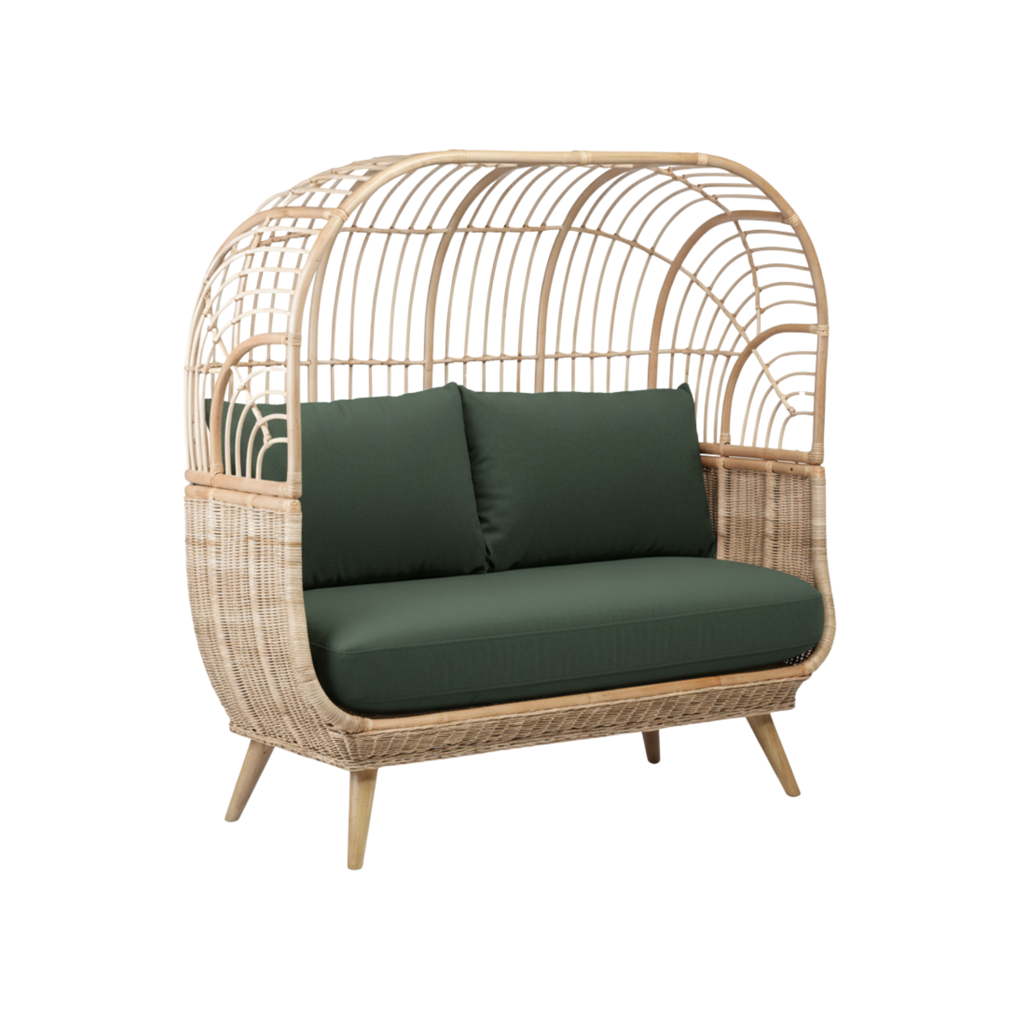 The cocoon sofa is the ultimate modern Cocoon Sofa in Velvet Green with a unique design creating a peaceful space surrounded by wicker. The natural colour wicker accentuates the weave design, with thick cane to create sturdy feet and handmade cushions topped with luxury foam to create a comfortable and supportive seating space.