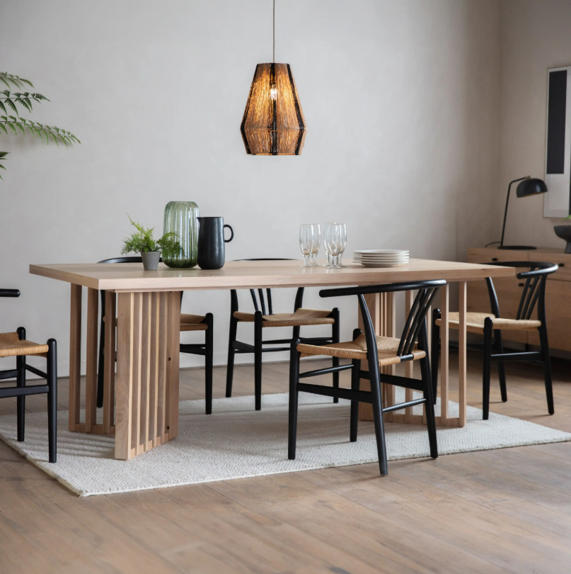 This dining table features solid oak slatted legs in a chevron layout, to create an eye-catching and unusual design feature.