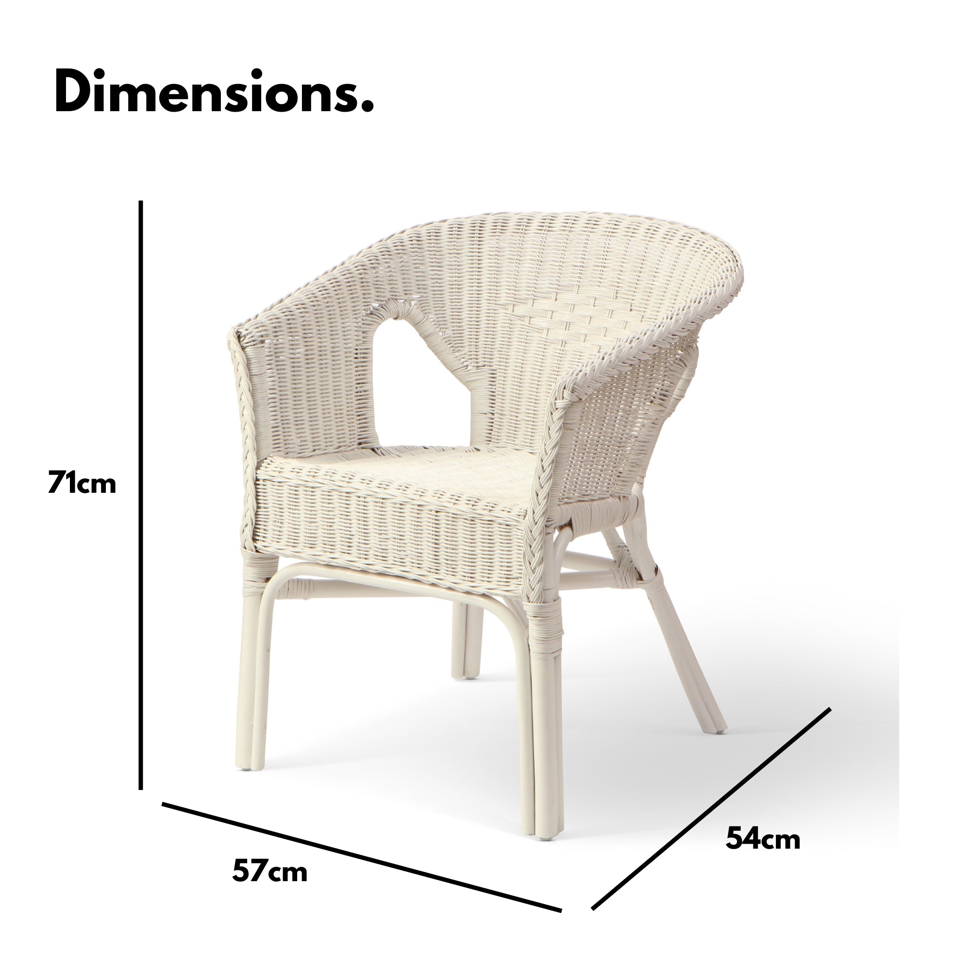 - DIMENSIONS: H71cm x W57cm x D54cm. Floor to seat is 44cm. Seat width 45cm.