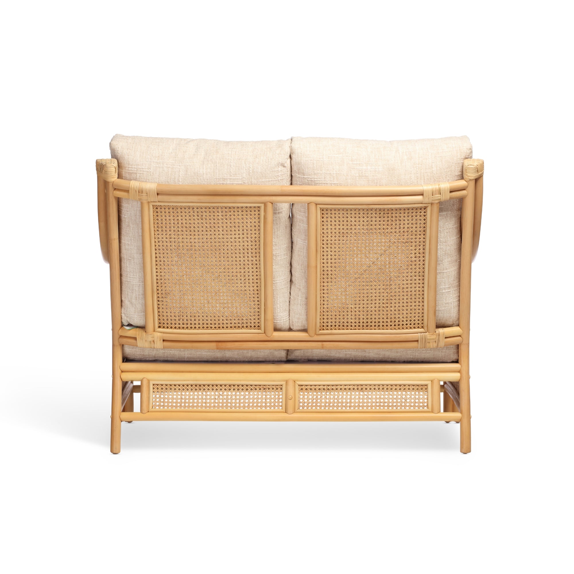- A beautifully hand-crafted 2-seat sofa made from natural rattan with sweeping cane arms and mesh cane panels.
