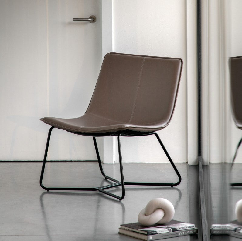 This contemporary occasional chair embodies both comfort and style. Its chic design features a curved seat, upholstered in faux leather, and sleek black metal frame. It is available in two other colours.