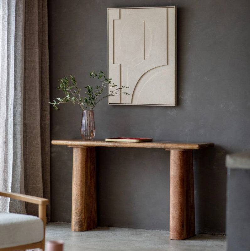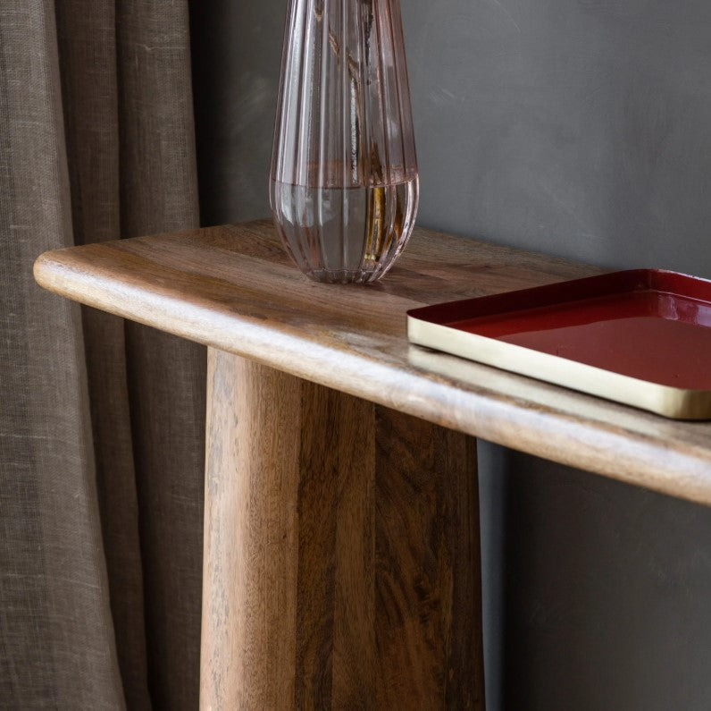 Unusual console table featuring chunky legs and top, with soft flowing curves which soften the look, to create a beautiful sturdy piece. It is crafted from solid mango wood with a natural finish to show the stunning grain of the timber.