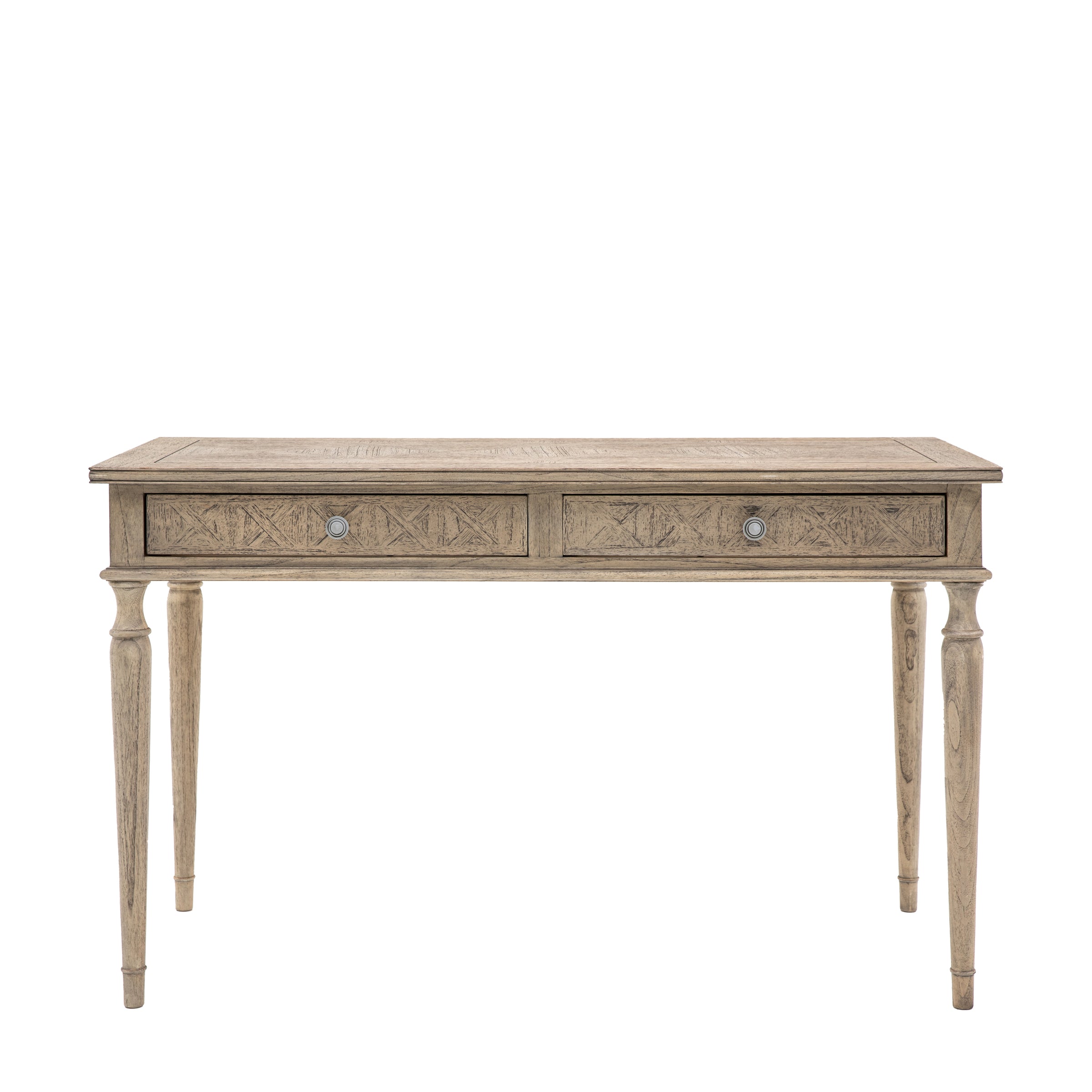 With its beautiful inlaid parquet design and elegant turned legs, this 2 drawer desk oozes effortless style and appeal. Made from Mindy wood which is lightly brushed to recreate a natural ageing effect, its subtle finish and classy design suits a range of interiors. The 2 drawers add practical storage, to help keep tidy.