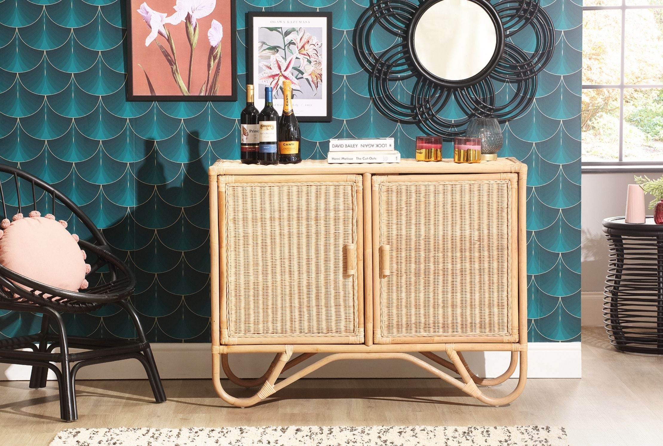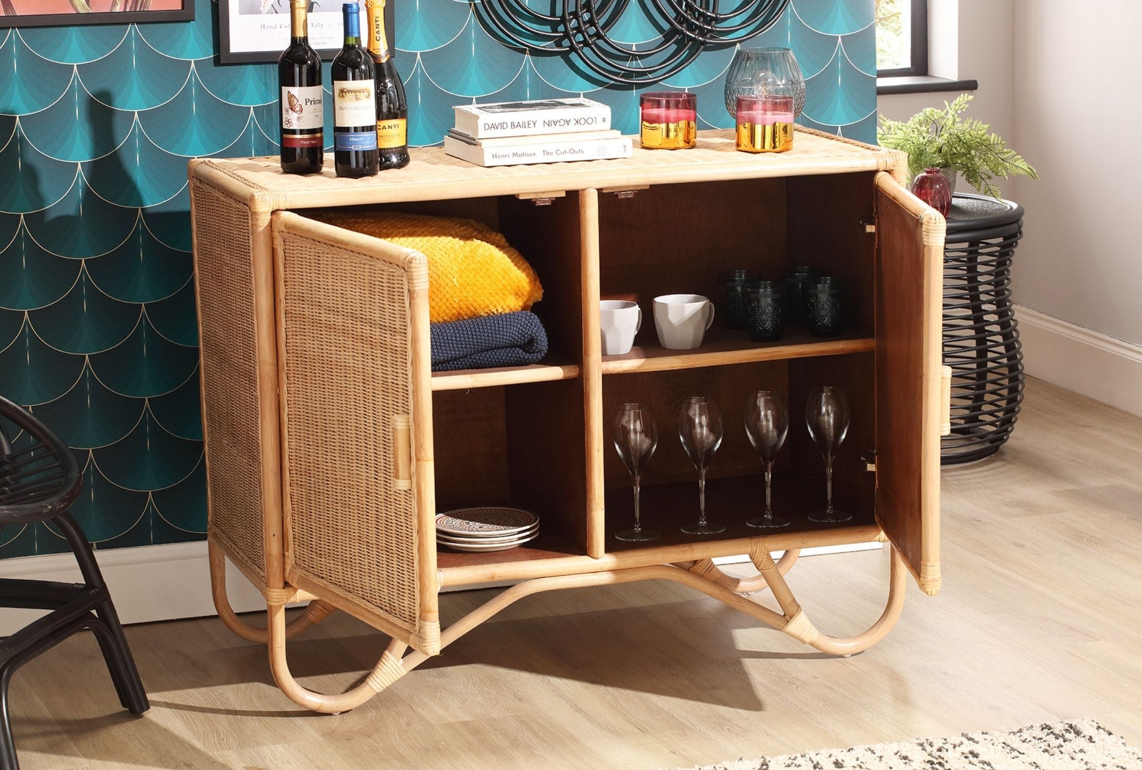 The perfect cabinet to store away items whilst looking chic. The natural rattan material gives this piece a boho style. With two doors that open wide and splits the interior of the cabinet into 4 with one sturdy shelf and centre piece.
