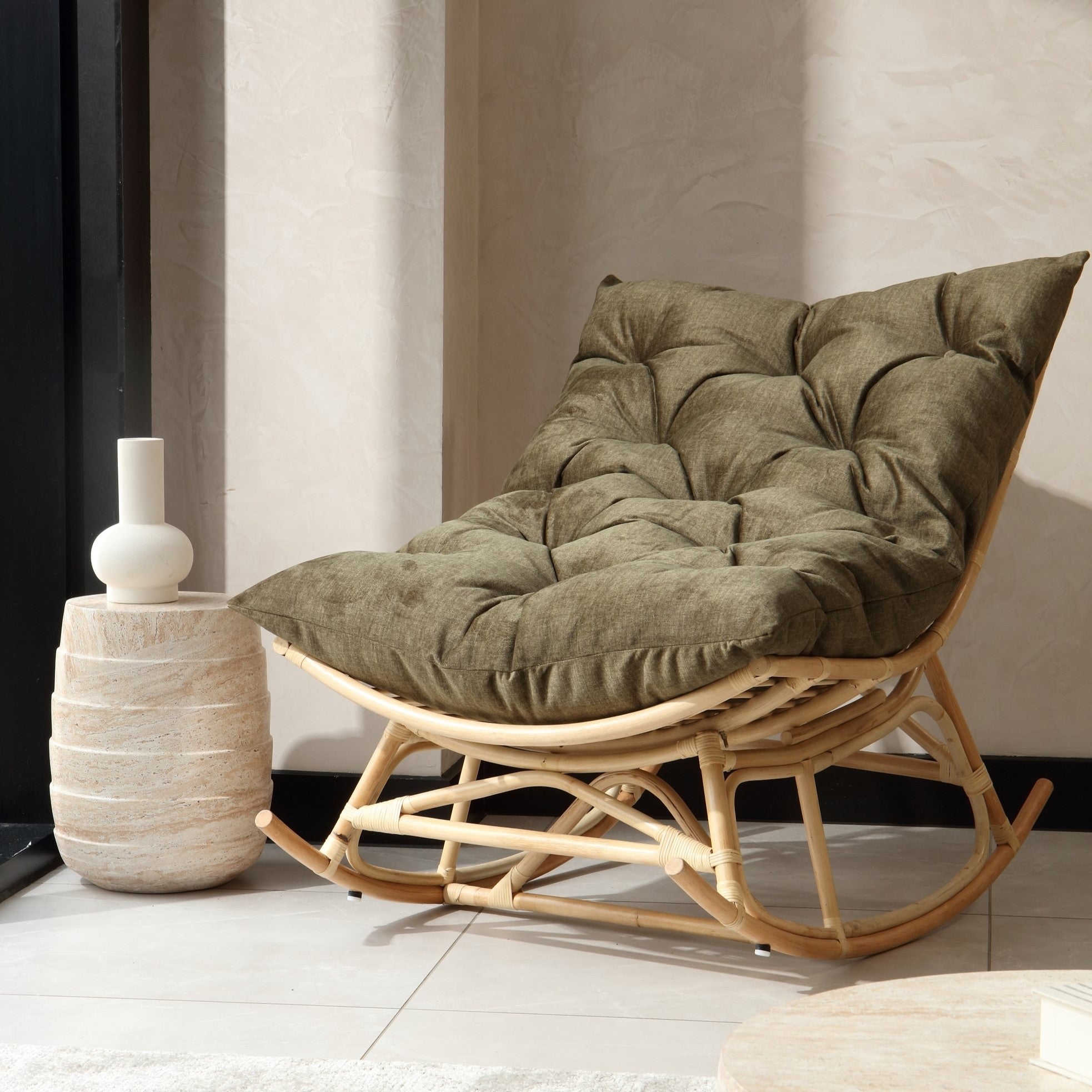 Natural Rattan Papasan Rocking Chair - Square Shape Cushion Olive