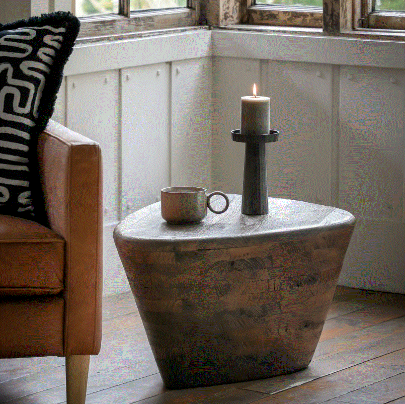 This stunning mango wood side table has the most unusual triangular shape with a patinated laminated angled base, which is hollow underneath, making it light & easy to move around. A matching coffee table is available.