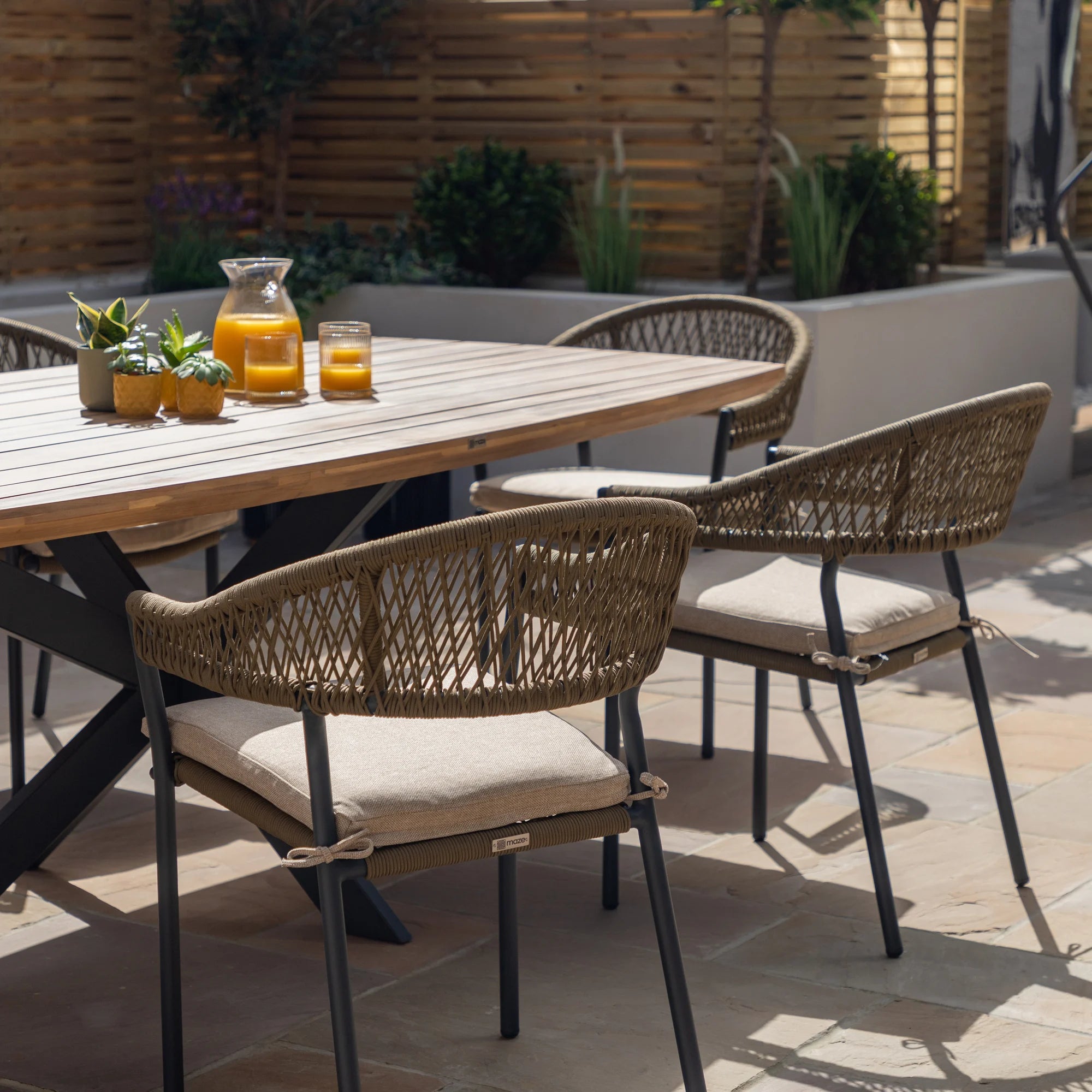 Perfect for family lunches and social gatherings, our fabulous dining set comes complete with 8 stackable chairs. Each chair is curved in shape with slender dark grey powder coated legs, with a woven olive green rope design and includes oatmeal fabric tie-back seat cushion. The fixed Oval sustainably sourced acacia wood top dining table mimics the deck of a yacht, this Riga dining table set creates an ambience of authentic charm, while its crossover metal frame base gives it a contemporary look.