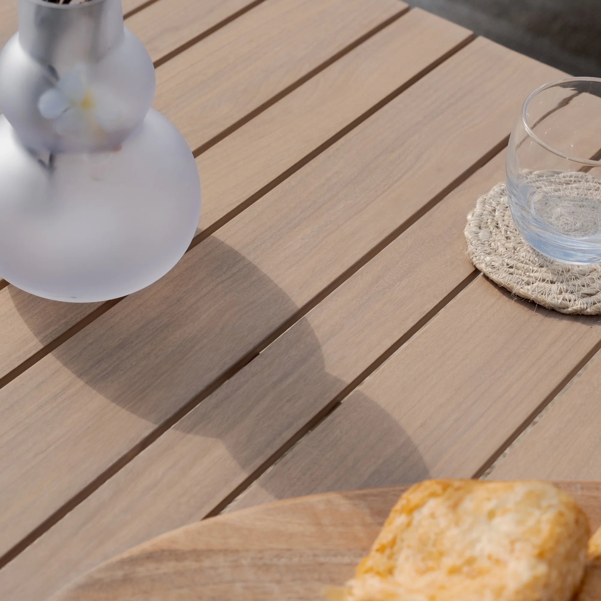The intricately woven polypropylene rope detail surrounds the robust framework allowing the furniture to be left outside all year round, paired with our high performance cushions which are stain, water, and fade-resistant. The plump seat and back cushions in a natural linen colour are perfectly matched the wood look framework and cream-coloured rope, exuding a natural warmth.